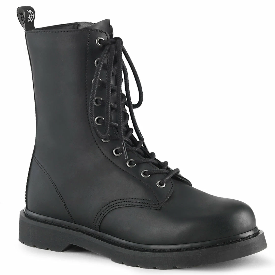 Stacked Flat Heel 10-Eyelet Lace-Up Mid Calf Unisex Vegan Boot with Back Pull-Tab