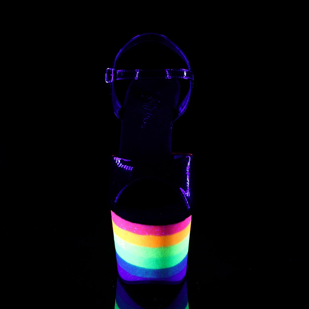 Rainbow Platform Ankle Strap Stripper Sandal Featuring Neon UV Reactive Rainbow-colored Platform Bottom