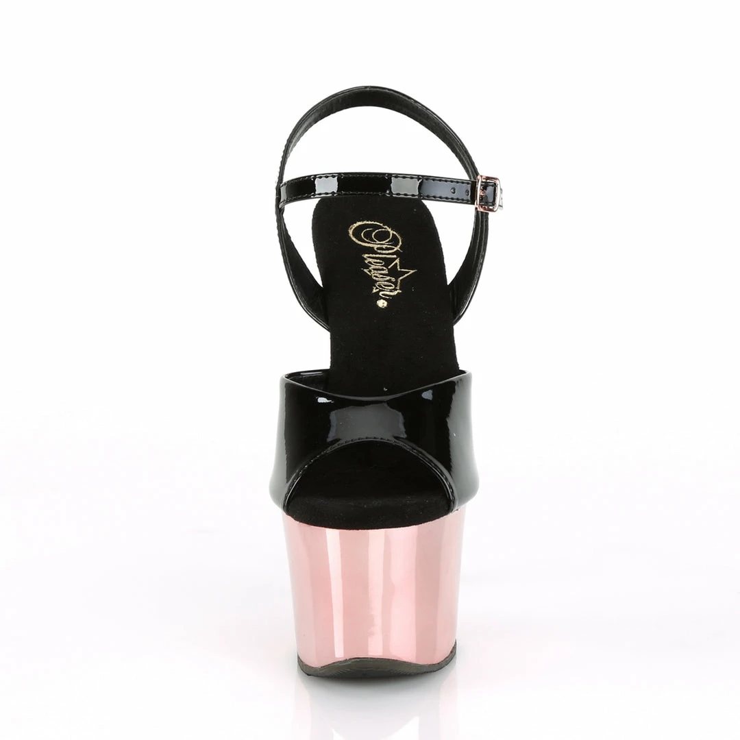 Platform Black Patent‚ Ankle Strap Sandal Featuring Rose Gold Chrome Plated Platform Bottom